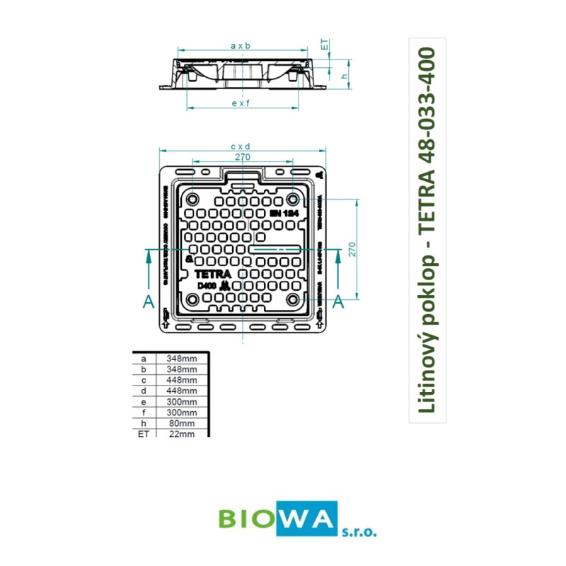 Litinový poklop TETRA 300 x 300 mm - D 400 - vodotěsný