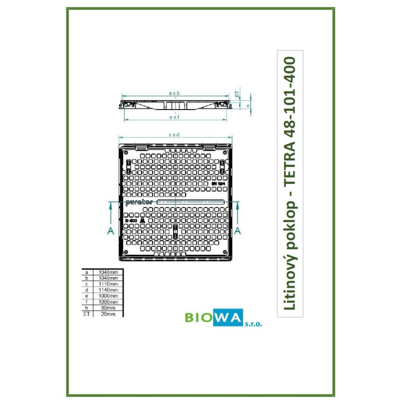 Litinový poklop TETRA 1000 x1000 mm - D 400 - vodotěsný