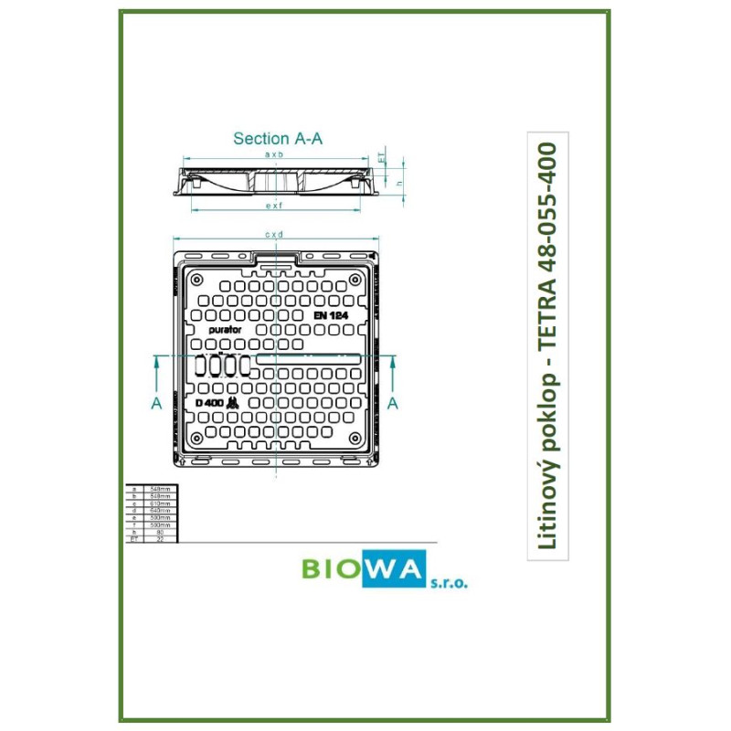 Litinový poklop TETRA 500x500 mm - D 400 - proti vzedmutí