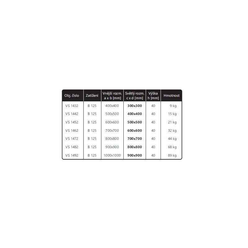Vnitřní rozměr : 610 x 610 mm Vnější rozměr rámu : 764 x 764 mm Stavební...